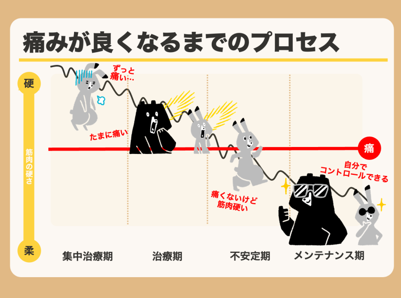 龍ヶ崎のぞみ整体院での施術を通して、痛みは以下の4つのフェーズで改善していきます。